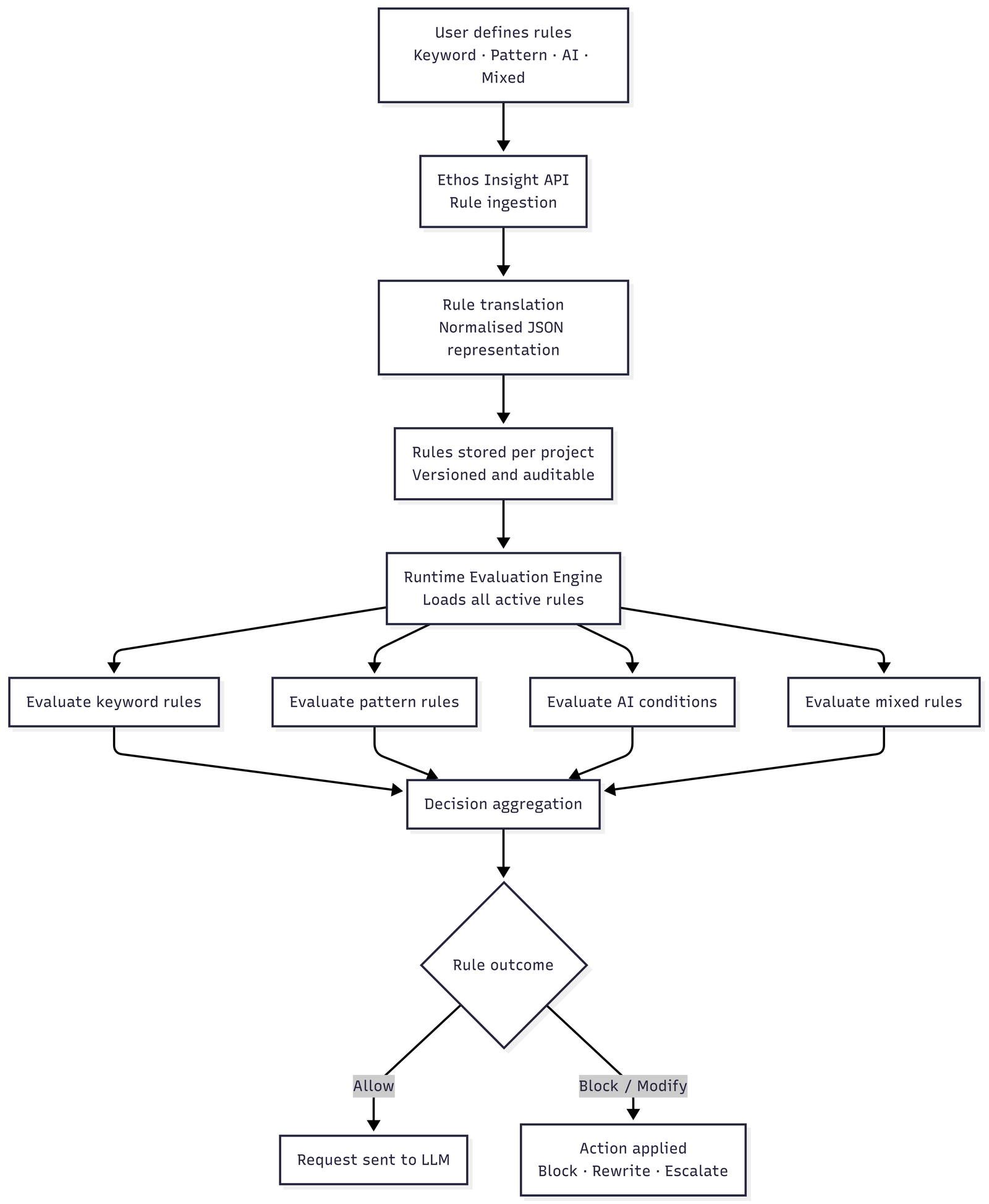 Rules are defined independently of application code and models. They can combine keyword checks, structural patterns, classifier signals and mixed logic. This allows behaviour to be changed without redeploying systems or rewriting prompts.